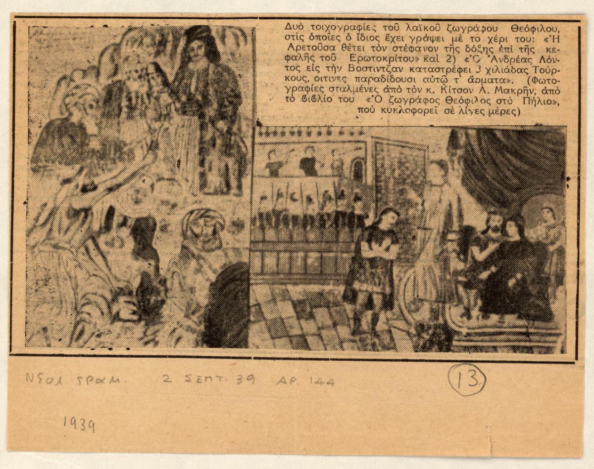 Απόκομμα, χαρτί, 13×16.5 εκ., δημοσίευσης αναπαραγωγών έργων του Θεόφιλου (Χατζημιχαήλ).
