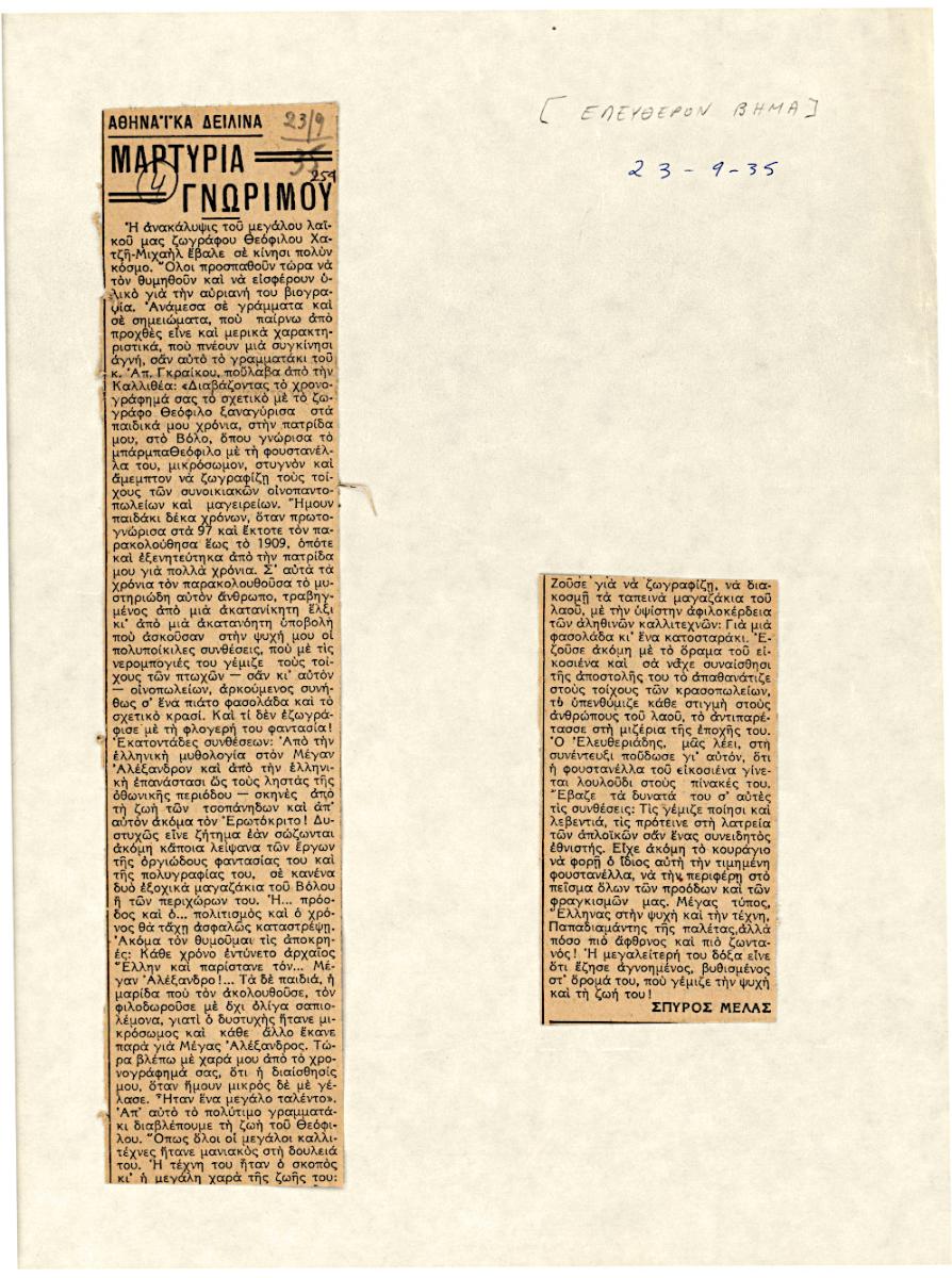 Απόκομμα, χαρτί, 2 τμχ κολλημένα σε λευκή κόλλα, 28×21 εκ., στα ελληνικά, δημοσίευσης άρθρου για τον Θεόφιλο (Χατζημιχαήλ). Ειδικότερα, αναγράφεται μια μαρτυρία στην οποία εξιστορείται η γνωριμία του Απ. Γραίκου με τον λαϊκό ζωγράφο.