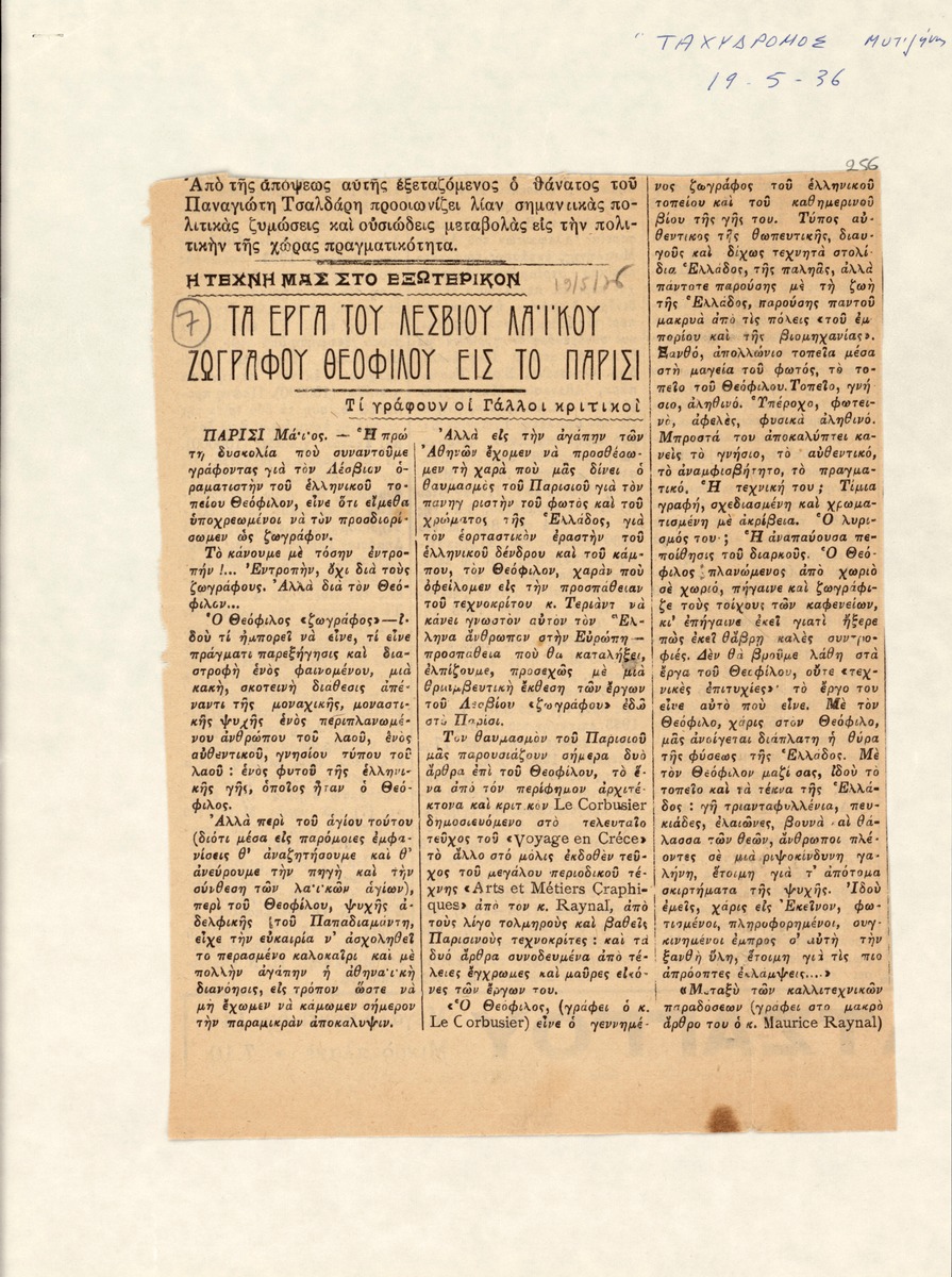 Απόκομμα του εντύπου “Ταχυδρόμος (Λέσβου)” (19/05/1936), όπου δημοσιεύεται άρθρο για τη ζωγραφική του Θεόφιλου (Χατζημιχαήλ) με αφορμή έκθεση έργων του στο Παρίσι. Δίνονται οι απόψεις Γάλλων κριτικών τέχνης.