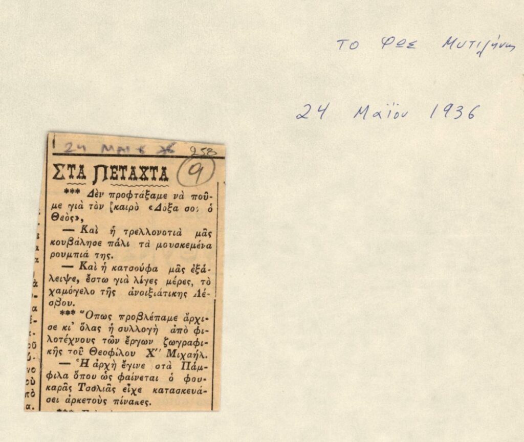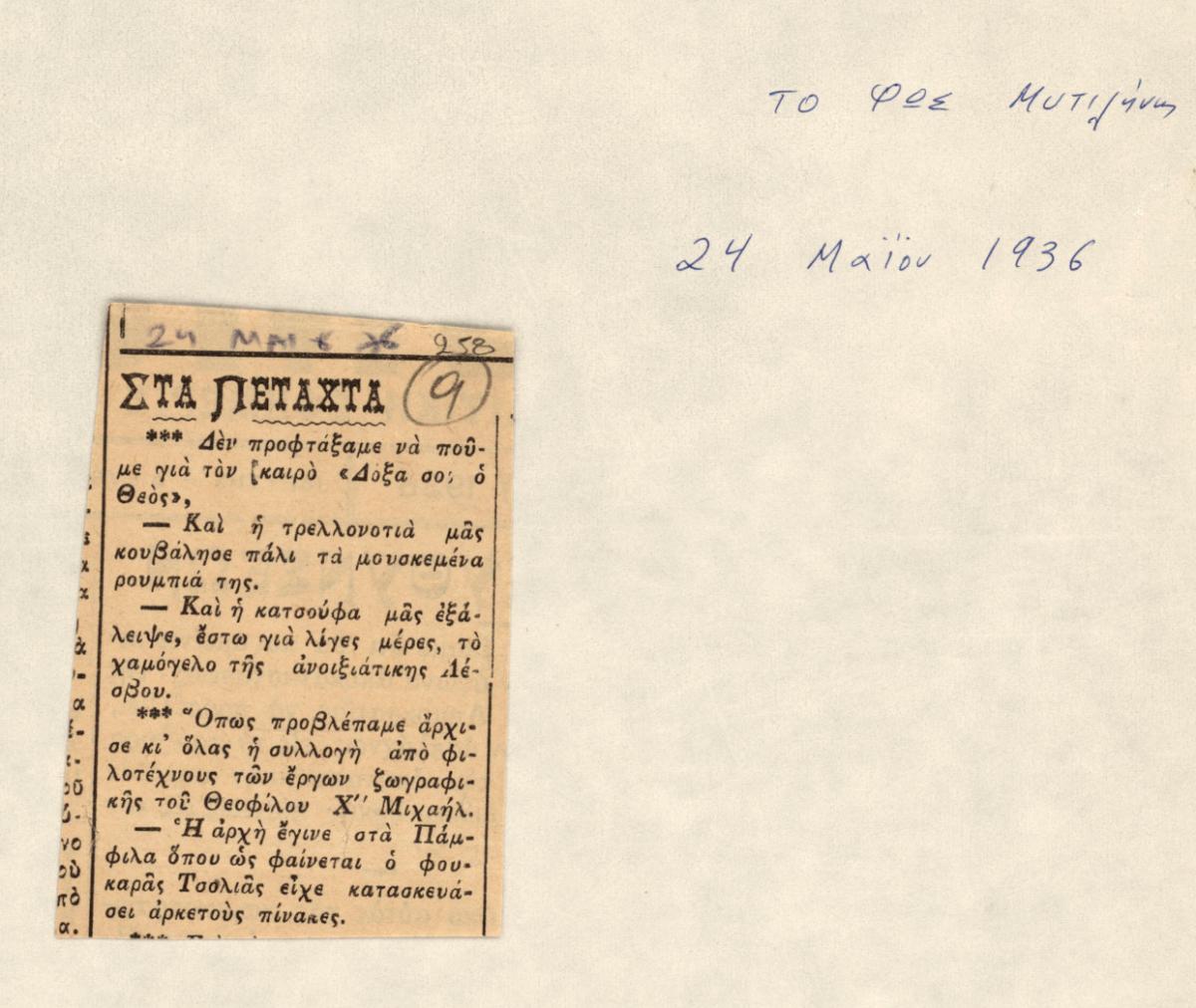 Απόκομμα, χαρτί κολλημένο σε λευκή κόλλα, 28×21 εκ., στα ελληνικά, δημοσίευσης άρθρου αναφερόμενου στον Θεόφιλο (Χατζημιχαήλ).