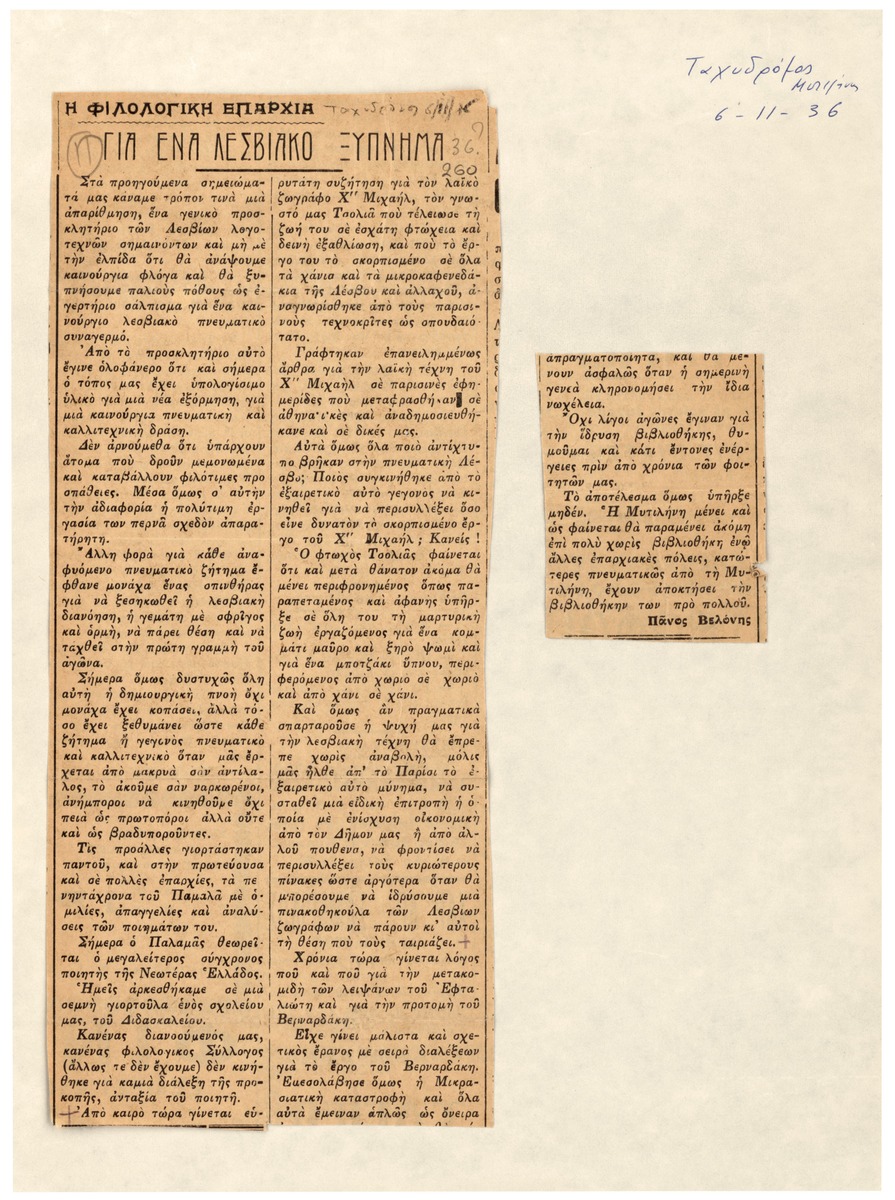 Απόκομμα του εντύπου “Ταχυδρόμος” (03/11/1936), όπου δημοσιεύεται άρθρο για τη ζωγραφική του Θεόφιλου (Χατζημιχαήλ) όπου σχολιάζεται ο απόηχος των έργων του στην Ελλάδα και στην Ευρώπη.