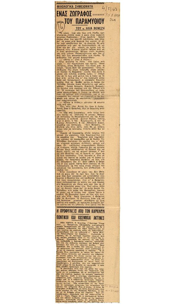 Απόκομμα, χαρτί, 38×8 εκ., στα ελληνικά, δημοσίευσης άρθρου για τον Θεόφιλο (Χατζημιχαήλ). Περιγράφεται συνάντηση με τον λαϊκό ζωγράφο.