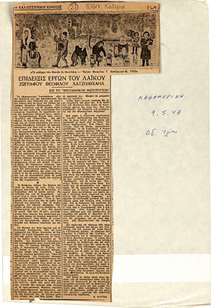 Απόκομμα, χαρτι, 31×21 εκ., στα ελληνικά, δημοσίευσης κριτικής έκθεσης του Θεόφιλου (Χατζημιχαήλ), η οποία διεξάγεται στο Βρετανικό Ινστιτούτο Αθηνών.