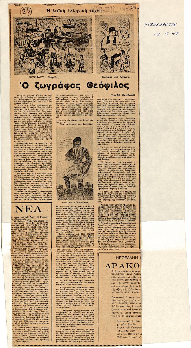 Απόκομμα, χαρτί κολλημένο σε λευκή κόλλα, 40×21 εκ., στα ελληνικά, δημοσίευσης άρθρου αναφερόμενου στη ζωγραφική του Θεόφιλου (Χατζημιχαήλ).