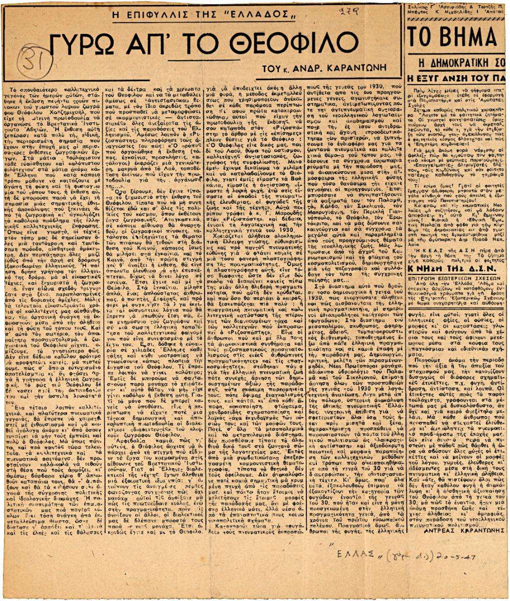 Απόκομμα της εφημερίδας “Ελλάς” (05/1947), όπου δημοσιεύεται άρθρο για τον λαϊκό ζωγράφο Θεόφιλο (Χατζημιχαήλ), τη ζωή και τη ζωγραφική του, με αφορμή έκθεση του στο Βρετανικό Ινστιτούτο Αθηνών.