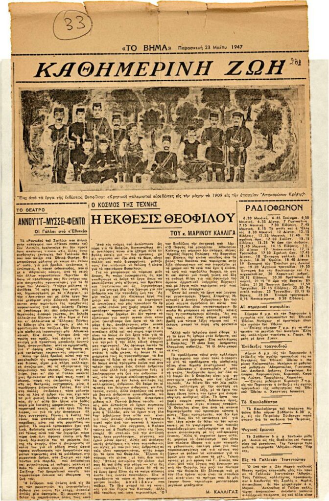 Απόκομμα, χαρτί κολλημένο σε λευκή κόλλα, 33×21 εκ., στα ελληνικά, δημοσίευσης κριτικής έκθεσης του Θεόφιλου (Χατζημιχαήλ), στο Βρετανικό Ινστιτούτο Αθηνών.