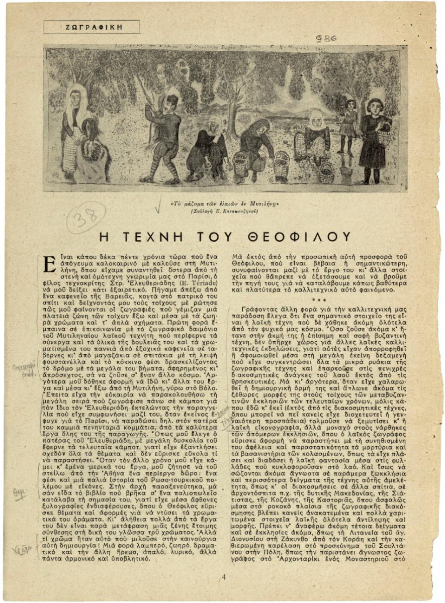 Απόκομμα, χαρτί, 4 φφ, 28×20 εκ., στα ελληνικά, δημοσίευσης άρθρου αναφερόμενου στη ζωγραφική του Θεόφιλου (Χατζημιχαήλ).