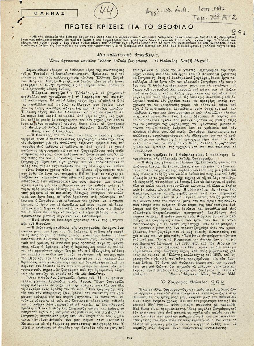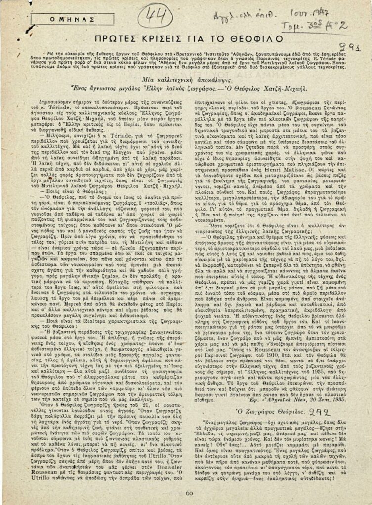 Απόκομμα, χαρτί, 2 φφ, 28×20 εκ., στα ελληνικά, αναδημοσίευσης άρθρου αναφερόμενου στη ζωή και στη ζωγραφική του Θεόφιλου (Χατζημιχαήλ). Τονίζεται πως ήταν αυτοδίδακτος.