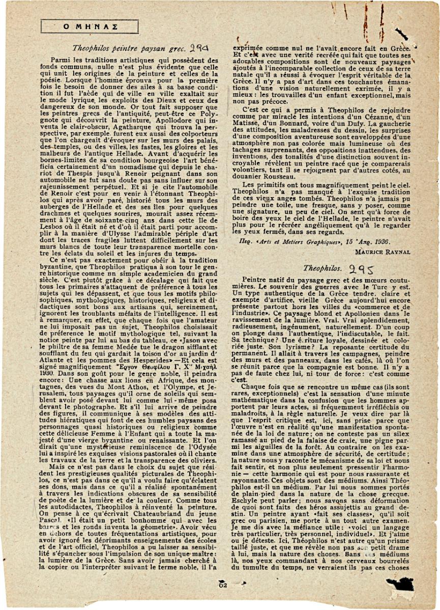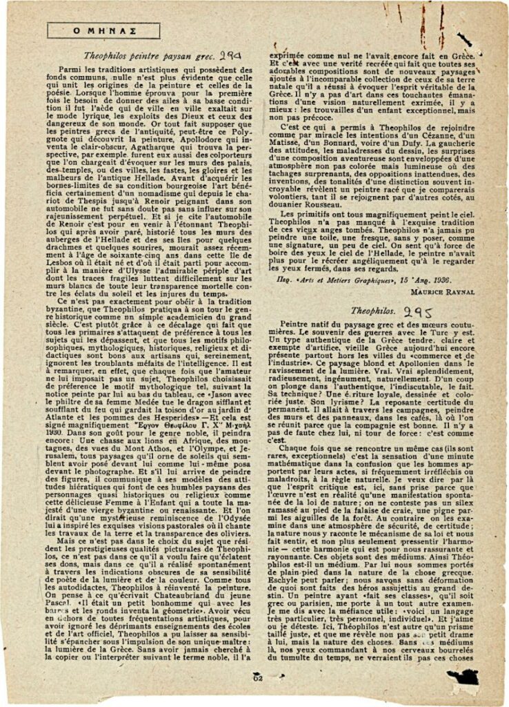 Απόκομμα, χαρτί, 28×21 εκ., στα γαλλικά, αναδημοσίευσης αποσπάσματος άρθρου για τον Θεόφιλο (Χατζημιχαήλ), με αφορμή έκθεση έργων του στο Βρετανικό Ινστιτούτο Αθηνών.