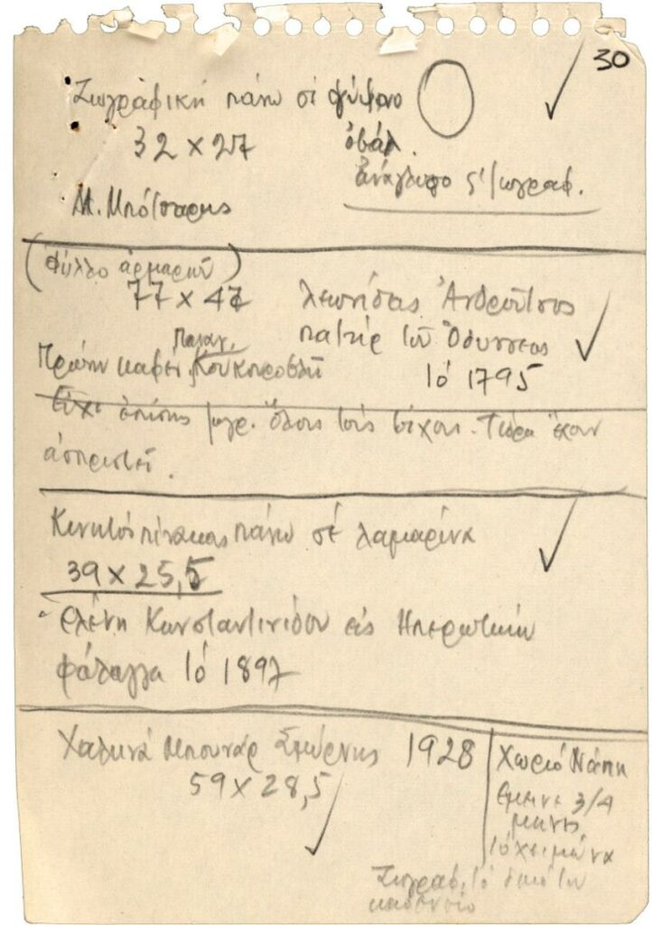 Χειρόγραφες σημειώσεις του Τώνη Σπητέρη για έργα του Θεόφιλου (Χατζημιχαήλ)