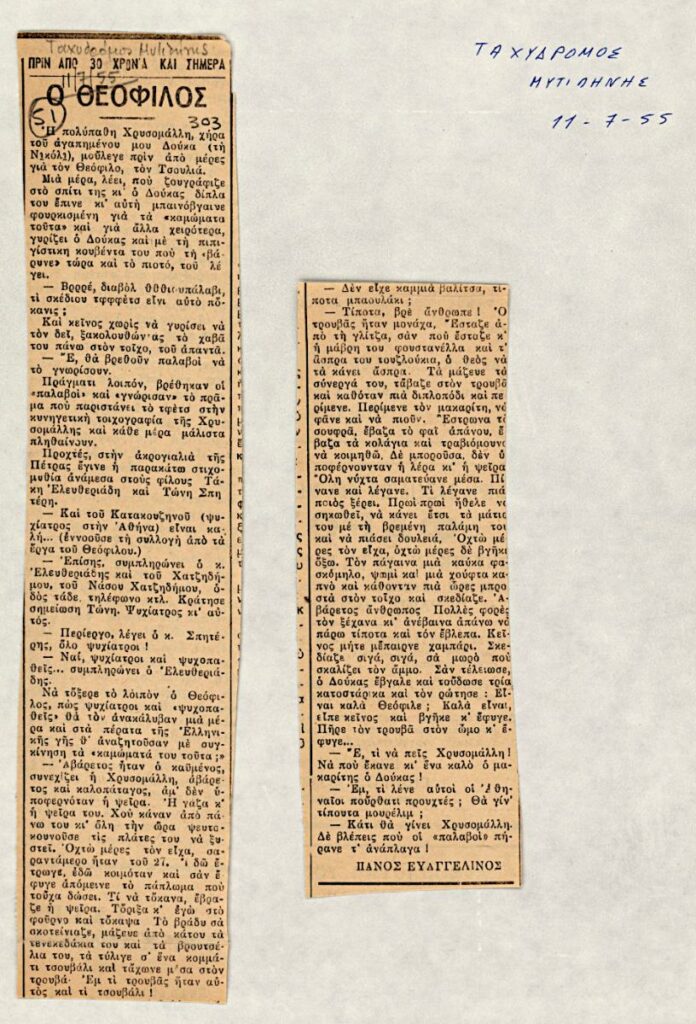 Απόκομμα, χαρτί, 2 τμχ κολλημένα σε λευκή κόλλα, 28×21 εκ., στα ελληνικά, δημοσίευσης διήγησης αναφερόμενης στην “ανακάλυψη” της ζωγραφικής του Θεόφιλου (Χατζημιχαήλ).