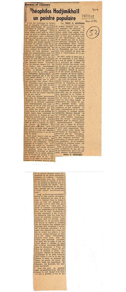 Απόκομμα, χαρτί, 55×21 εκ., στα γαλλικά, δημοσίευσης άρθρου αναφερόμενου στη ζωή και ζωγραφική του Θεόφιλου (Χατζημιχαήλ). Δίνονται πληροφορίες για την “ανακάλυψη” του ζωγράφου από τον Γ. Γουναρόπουλο και Σ. Ελευθεριάδη.