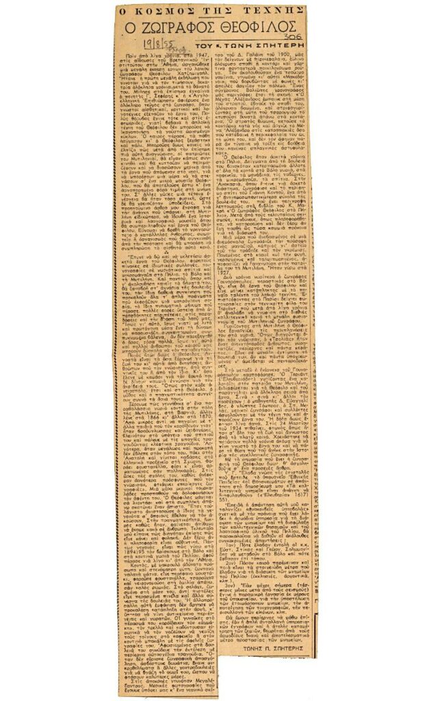 Απόκομμα, χαρτί, στα ελληνικά, δημοσίευσης άρθρου αναφερόμενου στη ζωγραφική του Θεόφιλου (Χατζημιχαήλ). Γίνεται λόγος για εκθέσεις του καλλιτέχνη, δίνονται βιογραφικές πληροφορίες και σχολιάζεται η “ανακάλυψή” του.