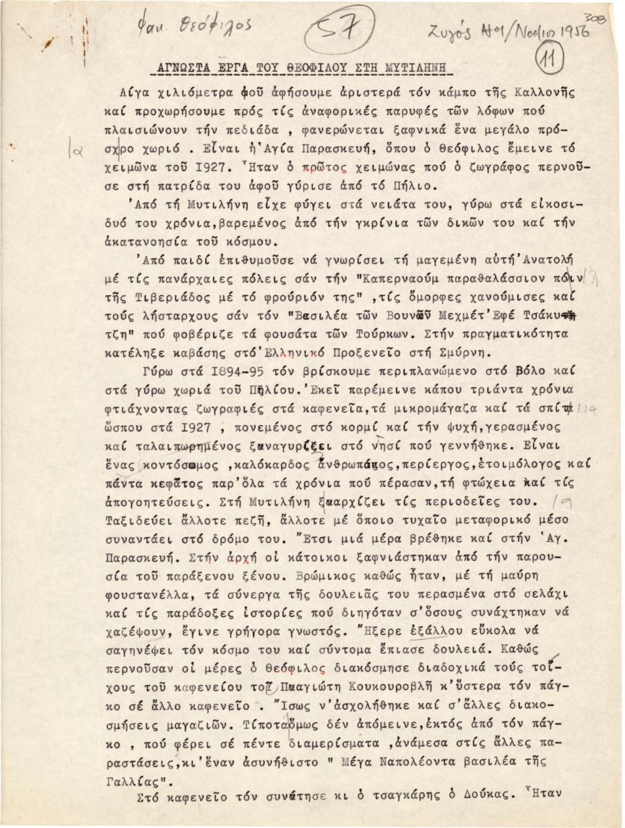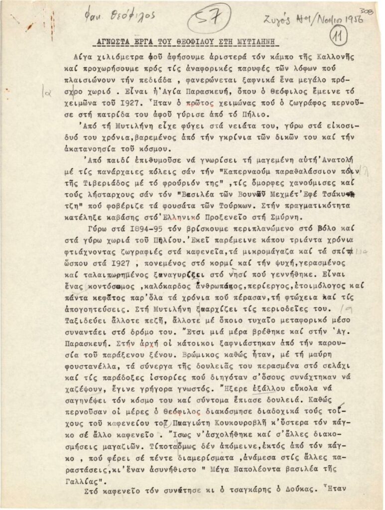 Αποτελεί προσχέδιο δημοσίευσης άρθρου του Τώνη Σπητέρη. Γίνεται λόγος για τον ζωγράφο Θεόφιλο (Χατζημιχαήλ), τη ζωή και το έργο του. Το άρθρο δημοσιεύτηκε στο περιοδικό “Ζυγός”, τεύχος 13 τον Νοέμβριο του 1956.