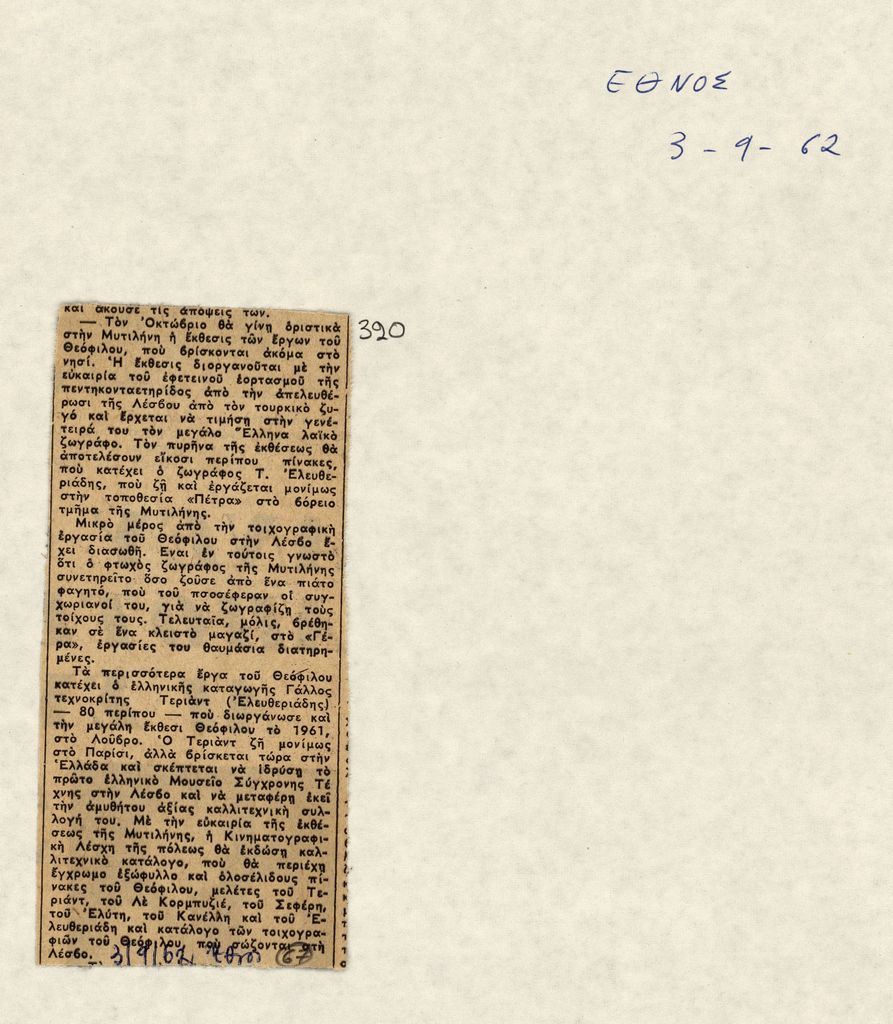 Απόκομμα, χαρτί κολλημένο σε λευκή κόλλα, 28×21 εκ., στα ελληνικά, δημοσίευσης άρθρου αναφερόμενου σε έκθεση έργων του Θεόφιλου (Χατζημιχαήλ) στη Μυτιλήνη.