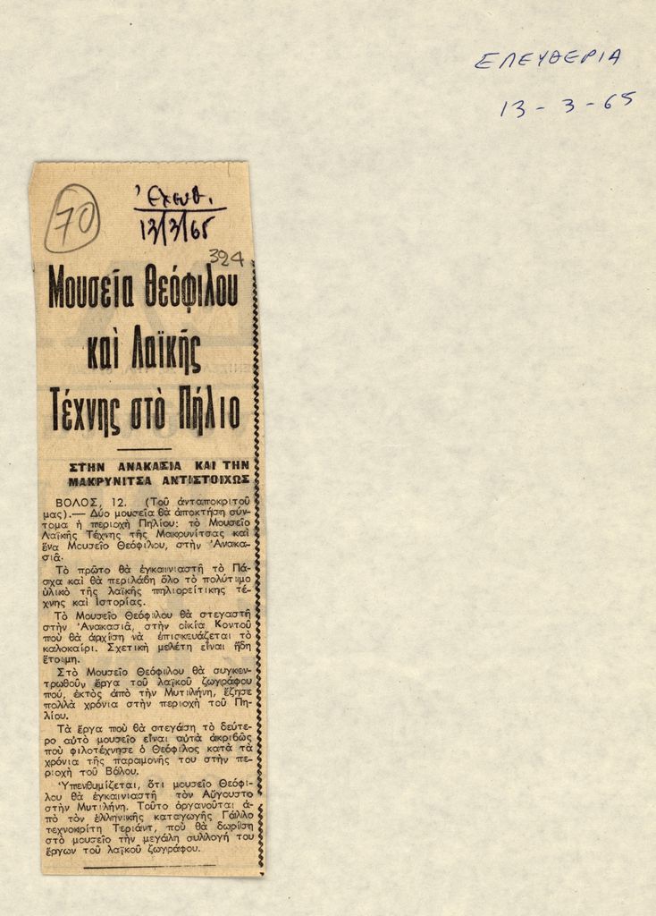 Απόκομμα, χαρτί κολλημένο σε λευκή κόλλα, 28×21 εκ., στα ελληνικά, δημοσίευσης άρθρου αναφερόμενου στη δημιουργία δύο μουσείων στο Πήλιο. Πρόκειται για τα “Μουσείο Λαϊκής Τέχνης”¨στη Μακρυνίτσα και “Μουσείο Θεόφιλου” στην Ανακασιά.