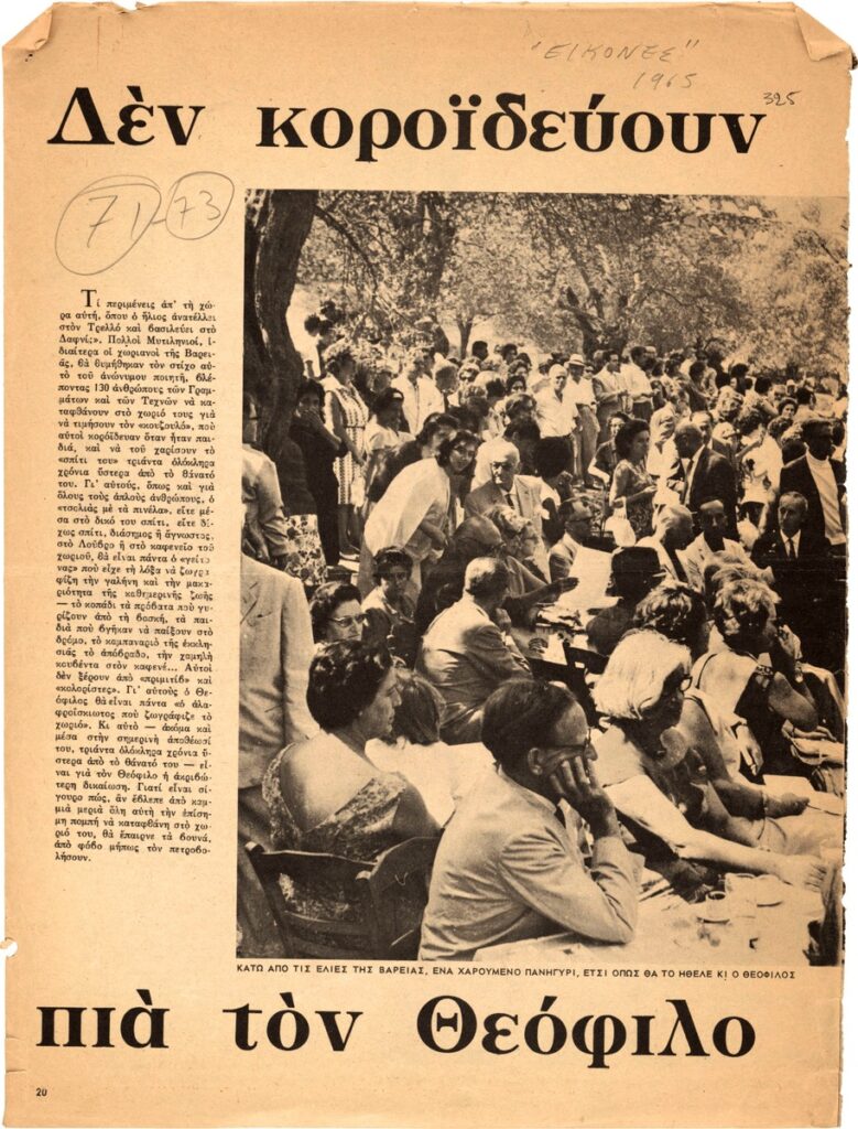 Απόκομμα του περιοδικού “Εικόνες” (1965), όπου δημοσιεύεται άρθρο με θέμα την προσέλευση στη Βαρειά Μυτιλήνης, με αφορμή τα εγκαίνια μουσείου του Θεοφίλου (Χατζημιχαήλ).
