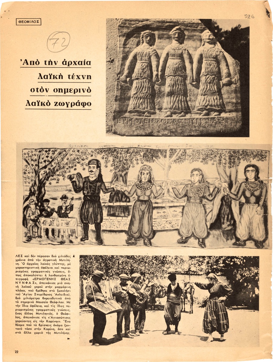 Απόκομμα του περιοδικού “Εικόνες” (1965), όπου δημοσιεύεται άρθρο για τον Θεόφιλο (Χατζημιχαήλ) και τα εγκαίνια του μουσείου που στεγάζει τα έργα του στη Βαρειά Μυτιλήνης.