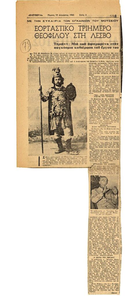 Απόκομμα, χαρτί, στα ελληνικά, δημοσίευσης άρθρου αναφερόμενου στα εγκαίνια του Μουσείου Θεόφιλου (Χατζημιχαήλ) στη Μυτιλήνη. Δίνονται πληροφορίες για τα έργα του που θα βρίσκονται σε αυτό καθώς επίσης γίνεται αναφορά σε τριήμερο εορταστικών εκδηλώσεων για τα εγκαίνια του Μουσείου.