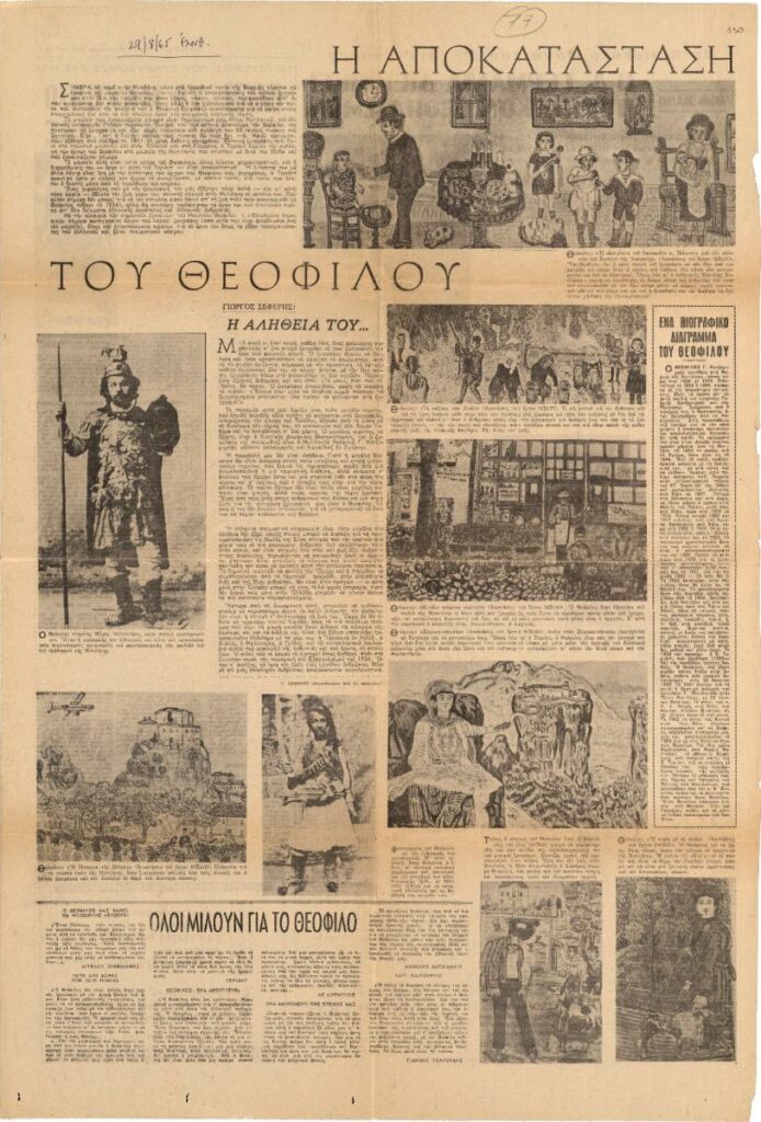 Απόκομμα, χαρτί, 63×42.5 εκ., στα ελληνικά, δημοσίευσης άρθρου αφιερωμένου στον Θεόφιλο (Χατζημιχαήλ). Δίνονται πληροφορίες και σχόλια για τα εγκαίνια του Μουσείου του στη Βαρειά Μυτιλήνης, απόσπασμα της ομιλίας του Γιώργου Σεφέρη καθώς και κρίσεις για τον λαϊκό ζωγράφο. Επίσης, χρονολόγιο-βιογραφικό του.