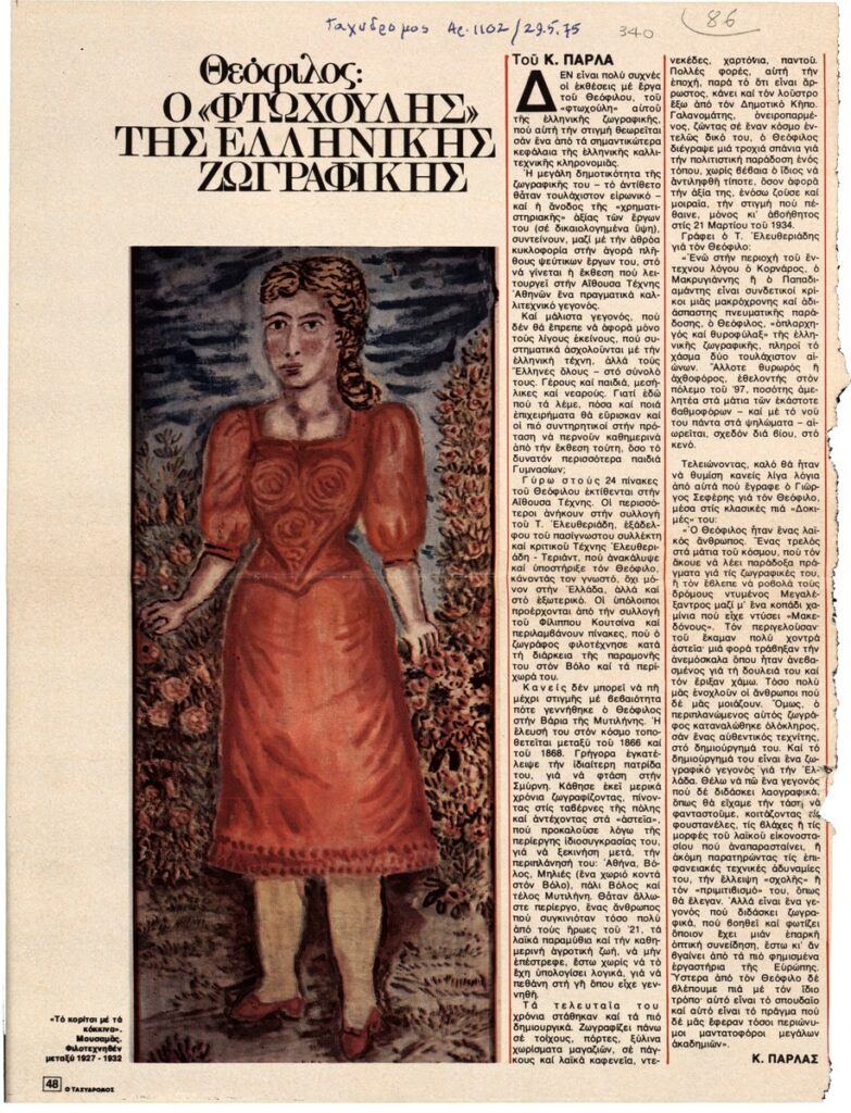 Απόκομμα του περιοδικού “Ο Ταχυδρόμος”, τεύχος 1102 (29/05/1975), όπου δημοσιεύεται άρθρο με θέμα την έκθεση έργων του Θεόφιλου (Χατζημιχαήλ) στην Αίθουσα Τέχνης Αθηνών.