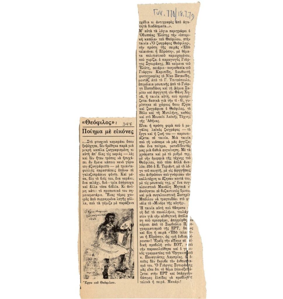 Απόκομμα, χαρτί ακανόνιστου μεγέθους, στα ελληνικά, δημοσίευσης άρθρου για τον Θεόφιλο (Χατζημιχαήλ), με αφορμή ταινία που οργανώνει η ΕΡΤ αφιερωμένη στον λαϊκό ζωγράφο.