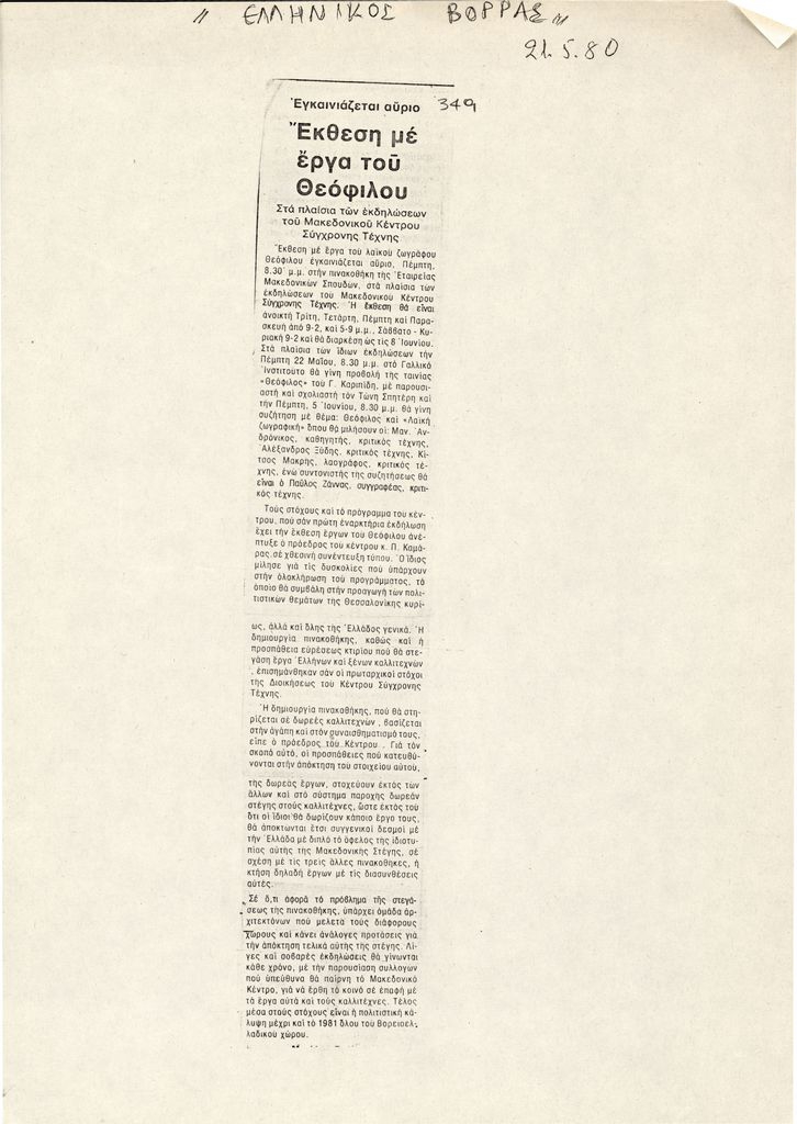 Φωτοαντίγραφο, χαρτί, 29×21 εκ., στα ελληνικά, δημοσίευσης άρθρου αναφερόμενου σε έκθεση έργων του Θεόφιλου (Χατζημιχαήλ), στο Μακεδονικό Κέντρο Σύγχρονης Τέχνης στην Θεσσαλονίκη.