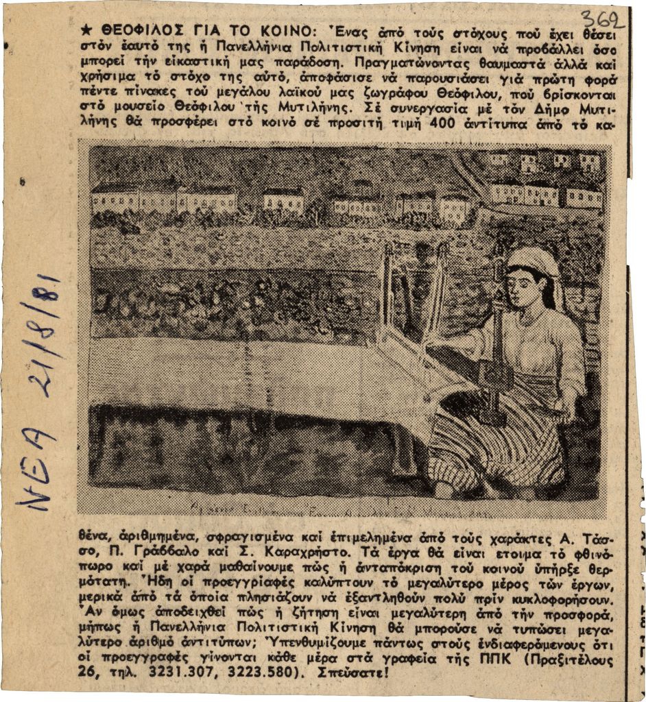 Απόκομμα, χαρτί, 12,5×11 εκ., στα ελληνικά, δημοσίευσης άρθρου αναφερόμενου σε κυκλοφορία αντιτύπων έργων του Θεόφιλου (Χατζημιχαήλ), επιμελημένα από τους χαράκτες Α. Τάσσο, Π. Γράββαλο και Σ. Καραχρήστο, στο πλαίσιο προβολής της λαϊκής παράδοσης και τέχνης.