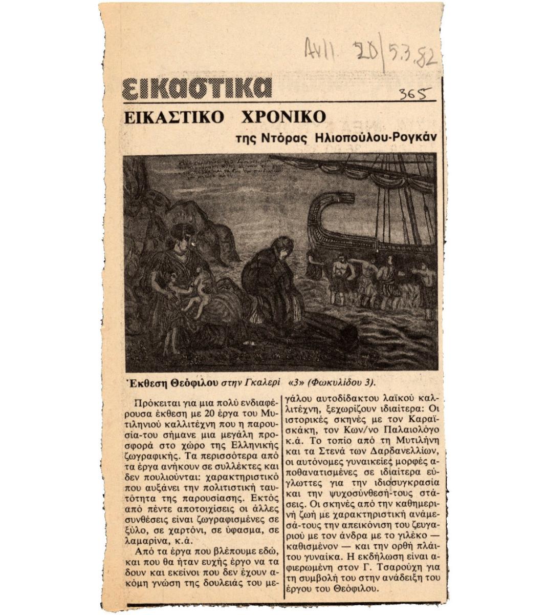 Απόκομμα, χαρτί, 17,5×10 εκ., στα ελληνικά, δημοσίευσης κριτικής έκθεσης έργων του Θεόφιλου (Χατζημιχαήλ), η οποία διεξάγεται στην Αθήνα.