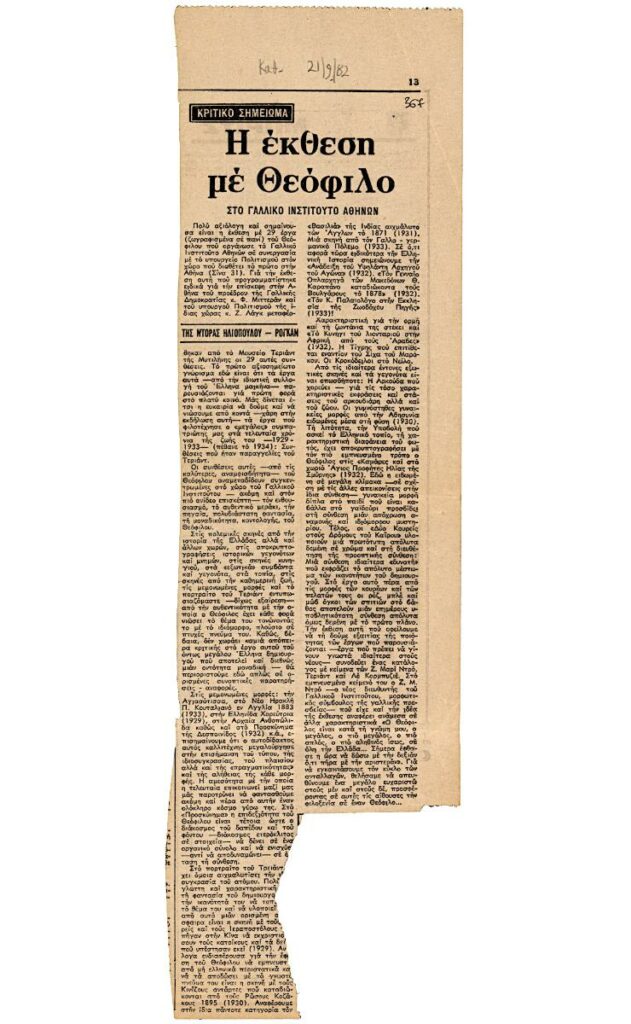Απόκομμα, χαρτί, στα ελληνικά, δημοσίευσης κριτικής έκθεσης έργων του Θεόφιλου (Χατζημιχαήλ), η οποία διεξάγεται στο Γαλλικό Ινστιτούτο Αθηνών σε συνεργασία με το Υπουργείο Πολιτισμού.