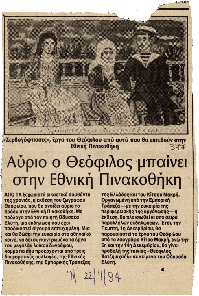 Απόκομμα, χαρτί, 15,5×10 εκ., στα ελληνικά, δημοσίευσης άρθρου αναφερόμενου σε εγκαίνια έκθεσης έργων του Θεόφιλου (Χατζημιχαήλ) στην Εθνική Πινακοθήκη.