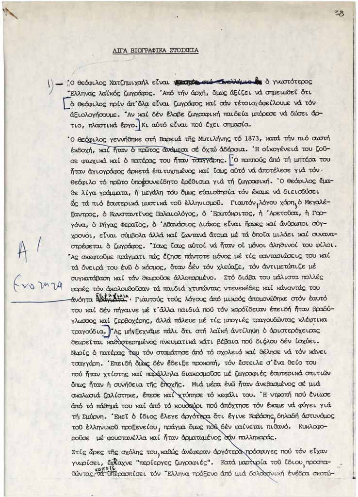 Δακτυλόγραφο κείμενο, χαρτί, 7 φφ, 29×21 εκ., στα ελληνικά, αναφερόμενο στη ζωή και στη ζωγραφική του Θεόφιλου (Χατζημιχαήλ). Δίνεται κατάλογος έργων του.