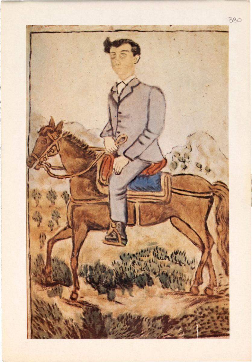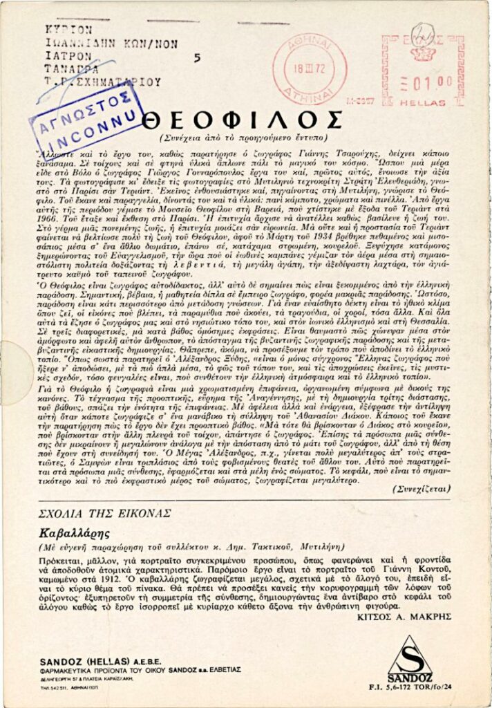Έντυπο με φωτογραφία έργου του λαϊκού ζωγράφου Θεόφιλου (Χατζημιχαήλ) και απόσπασμα κειμένου του Κίτσου Μακρή για τον ζωγράφο και το έργο του.
