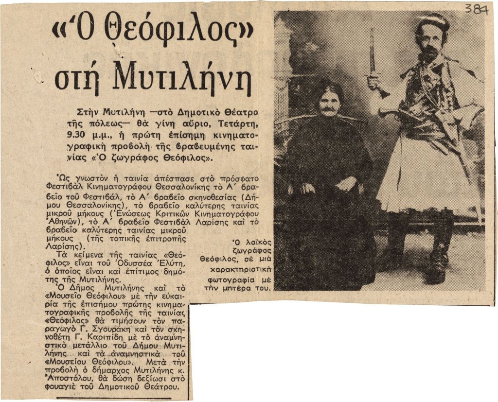Απόκομμα, χαρτί, στα ελληνικά, δημοσίευσης άρθρου το οποίο αναφέρεται στην πρεμιέρα ταινίας για τον Θεόφιλο (Χατζημιχαήλ). Η ταινία θα προβληθεί στο Δημοτικό Θέατρο Μυτιλήνης. Δίνονται σχετικές πληροφορίες.
