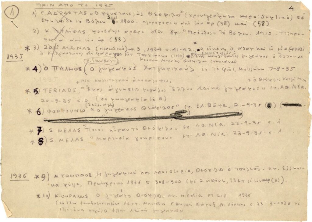 Χειρόγραφη βιβλιογραφία του Τώνη Σπητέρη, χαρτί, 5 φφ, 18×25 εκ., στα ελληνικά, για τον Θεόφιλο (Χατζημιχαήλ). Αναγράφονται δημοσιεύσεις κατά την περίοδο 1935-1947.