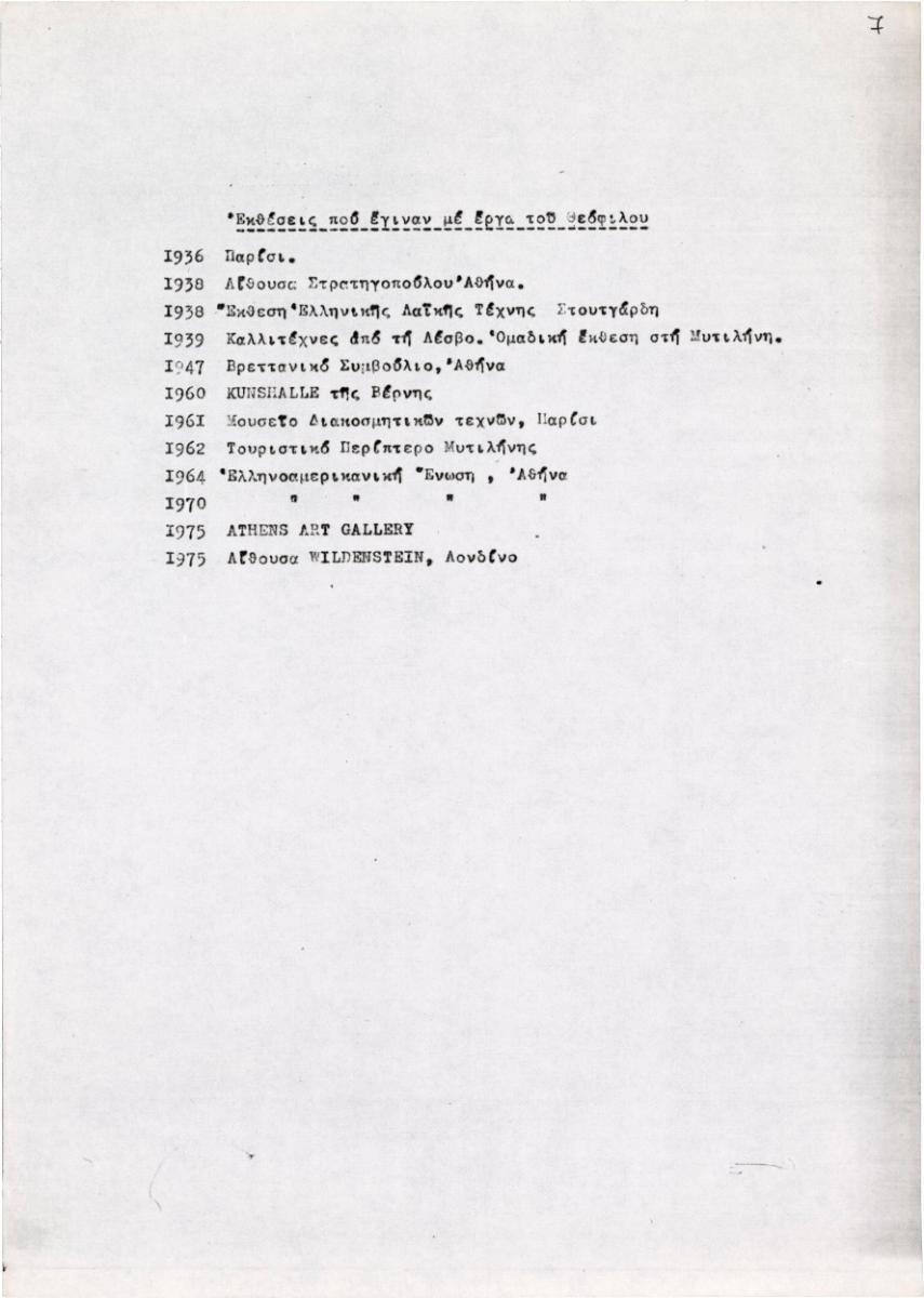 Δακτυλόγραφη λίστα εκθέσεων του Θεόφιλου (Χατζημιχαήλ), χαρτί, 29×21 εκ., στα ελληνικά.