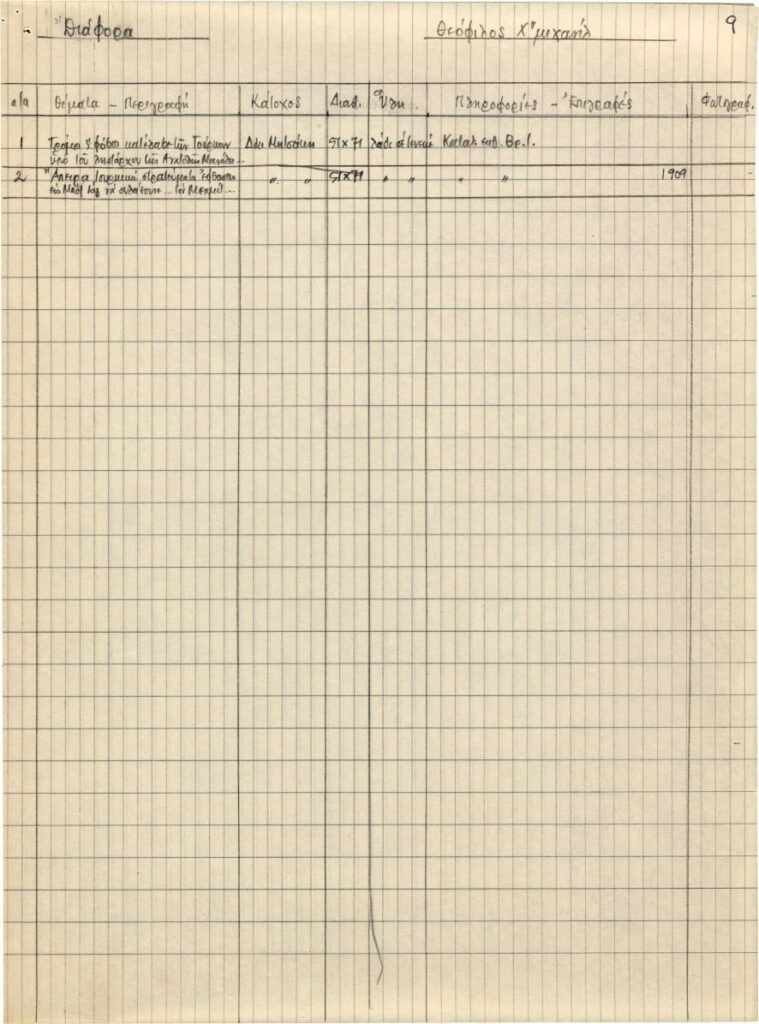 Χειρόγραφη εργογραφία για τον Θεόφιλο (Χατζημιχαήλ), χαρτί, 29×21 εκ., στα ελληνικά.