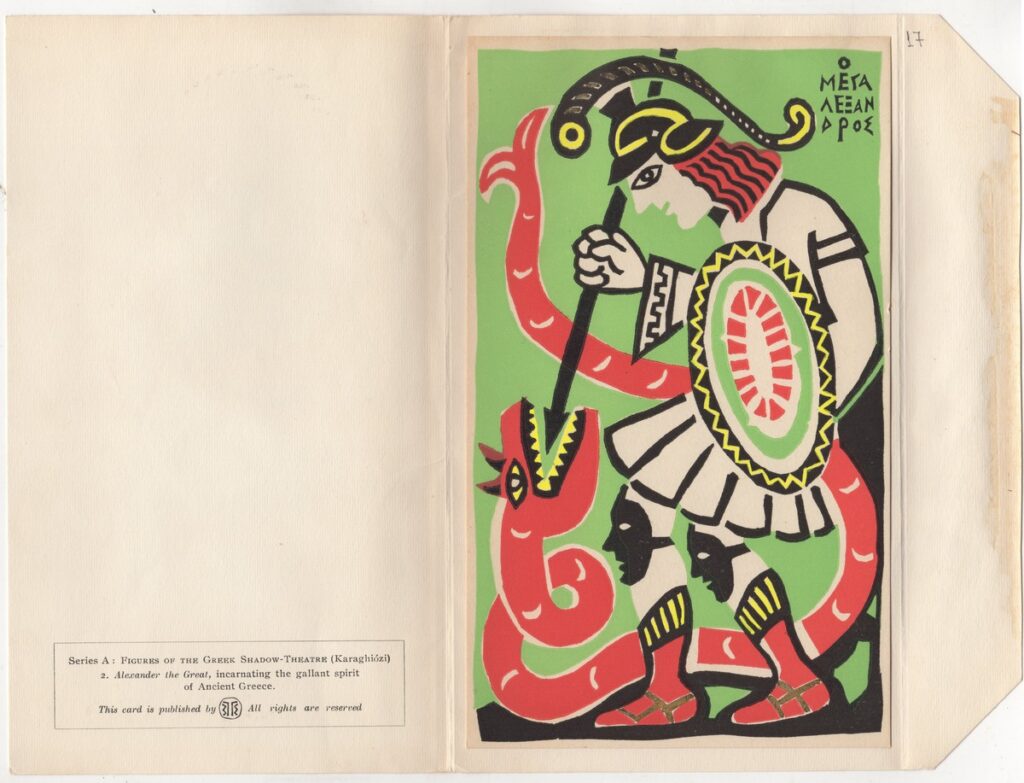 Αναπαραγωγή φιγούρας του Θεάτρου Σκιών Καραγκιόζη σε έντυπη κάρτα.