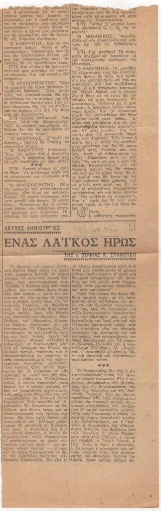 Απόκομμα της εφημερίδας “Τα Νέα” (13/01/1941), όπου δημοσιεύεται άρθρο με θέμα τον Καραγκιόζη, ήρωα του Θεάτρου Σκιών. Σχολιάζεται το σύμβολο του ήρωα, οι επιρροές του στη ζωγραφική και η απήχησή του.