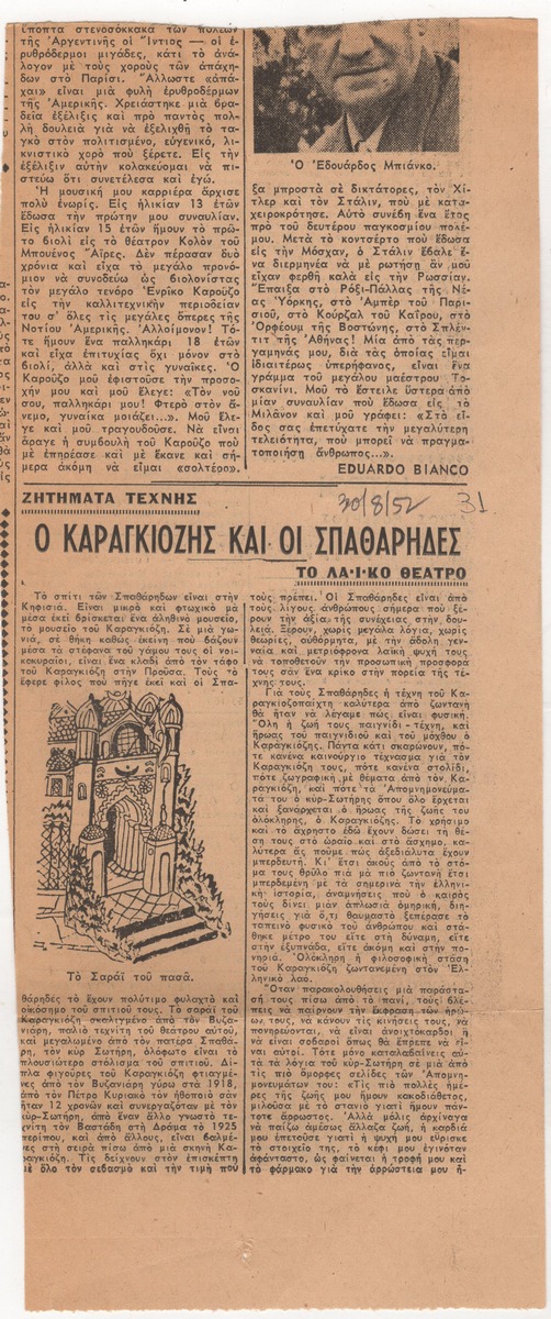 Απόκομμα της εφημερίδας “Τα Νέα” (30/08/1952), όπου δημοσιεύεται αφιέρωμα στους καραγκιοζοπαίχτες Ευγένιο και Σωτήρη Σπαθάρη.