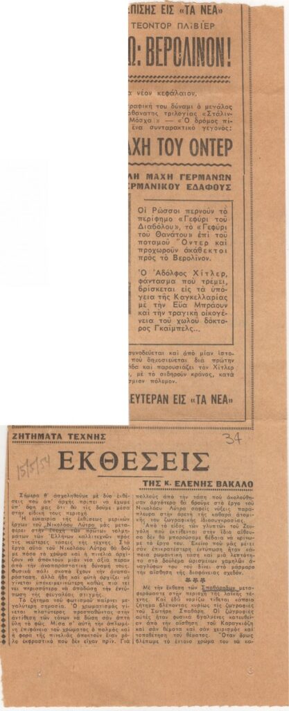 Απόκομμα της εφημερίδας “Τα Νέα” (15/05/1954), όπου δημοσιεύεται στήλη κριτικής της Ελένης Βακαλό. Σχολιάζεται έκθεση έργων των Νικόλαου Λύτρα και Γρηγόρη Ζευγώλη και έκθεση των Ευγένιου και Σωτήρη Σπαθάρη στον Αγγλοελληνικό Σύνδεσμο.