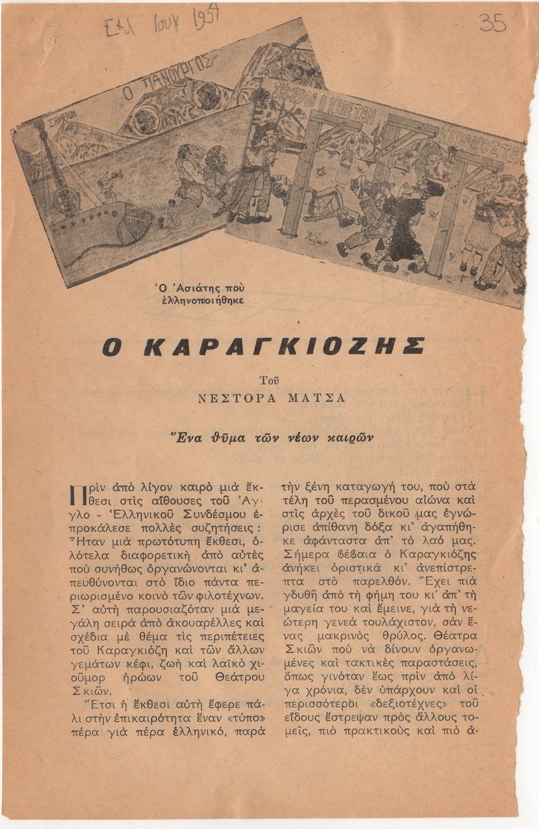 Απόκομμα του περιοδικού “Εκλογή” (06/1954), όπου δημοσιεύεται άρθρο με θέμα τον Καραγκιόζη, ήρωα του Θεάτρου Σκιών, με αφορμή έκθεση που διεξάγεται στον Αγγλοελληνικό Σύνδεσμο με έργα των Σωτήρη και Ευγένιου Σπαθάρη.