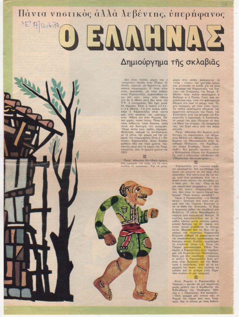 Απόκομμα του περιοδικού “Επίκαιρα” (τεύχος 97, 06/1970), όπου δημοσιεύεται άρθρο με θέμα τον χαρακτήρα του Καραγκιόζη και αναφέρονται οι λόγοι δημιουργίας του, οι καταβολές του, οι διαφορές ανάμεσα στο ελληνικό και τούρκικο τύπο.