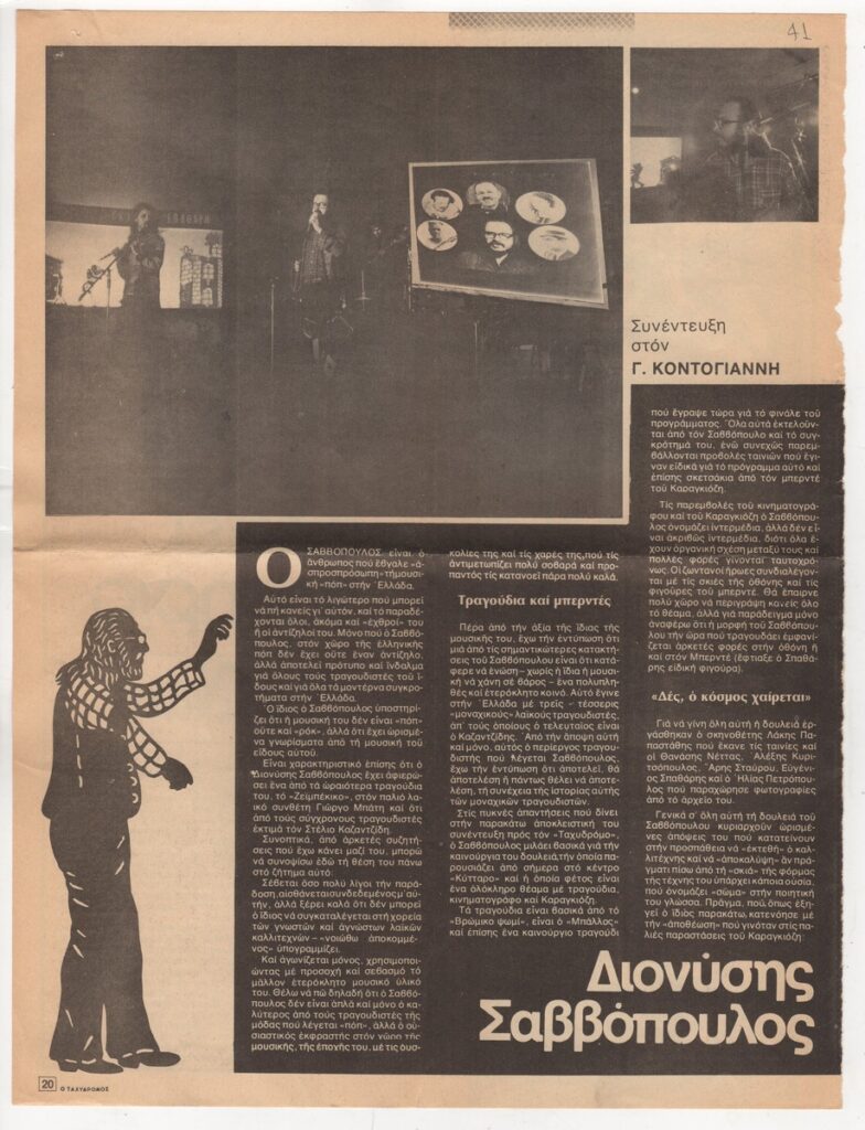 Απόκομμα του περιοδικού “Ο Ταχυδρόμος” (15/02/1974), όπου δημοσιεύεται συνέντευξη του Διονύση Σαββόπουλου με θέμα τις παραστάσεις Θεάτρου Σκιών στη μουσική σκηνή “Κύτταρο” στην Αθήνα.