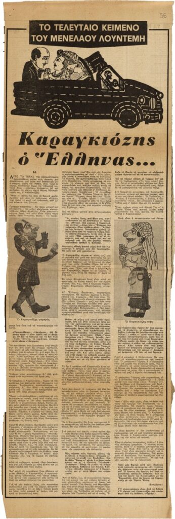Απόκομμα της εφημερίδας “Τα Νέα” (01/1977), όπου δημοσιεύεται σειρά κειμένων του Μενέλαου Λουντέμη για τον Καραγκιόζη, πρωταγωνιστή του Θεάτρου Σκιών με αναφορά στον συμβολισμό του χαρακτήρα.