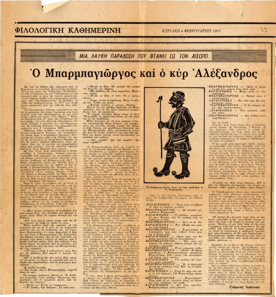 Απόκομμα της εφημερίδας “Η Καθημερινή” (06/02/1977), όπου δημοσιεύεται άρθρο με θέμα τα κοινά στοιχεία ανάμεσα στο διήγημα “Πανταρώτας” του Αλέξανδρου Παπαδιαμάντη και στο έργο του Μάρκου Ξάνθου με τίτλο “Ο Καραγκιόζης πλοίαρχος” που δημοσιεύτηκε το 1924 και 1971 από τις εκδόσεις “Ερμής”.