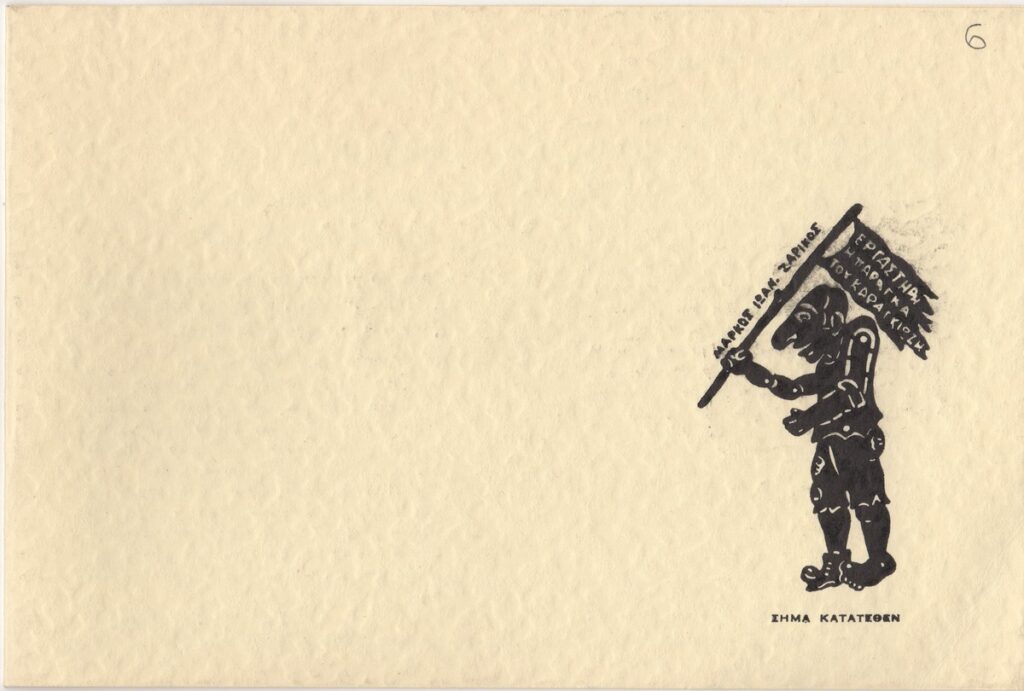 Πρόσκληση εγκαινίων έκθεσης φιγουρογραφιών του λαϊκού Θεάτρου Σκιών του Μάρκου Ζαρίκου, η οποία διεξάγεται στο Καλλιτεχνικό Πνευματικό Κέντρο Ώρα στην Αθήνα.