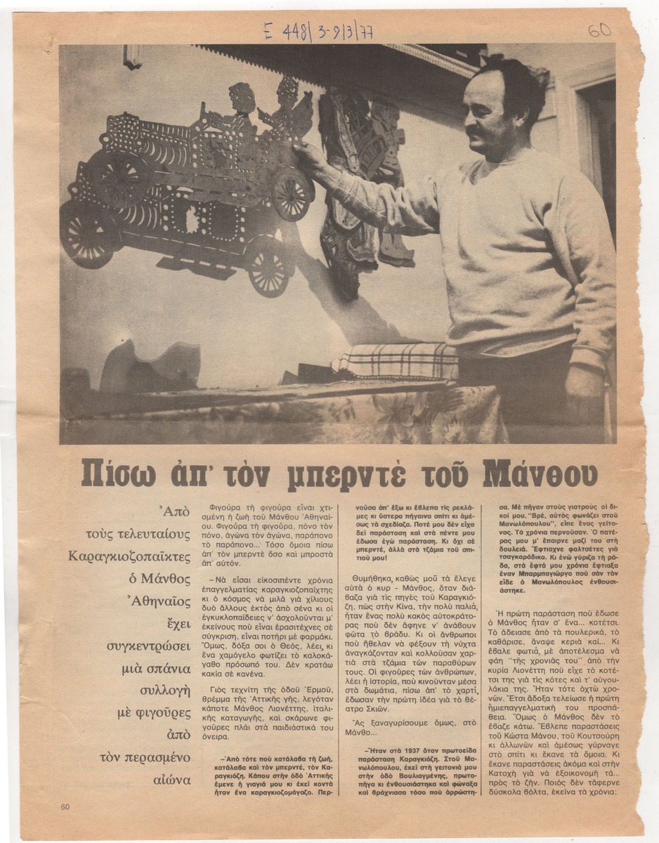 Απόκομμα του περιοδικού “Επίκαιρα”, όπου δημοσιεύεται άρθρο για τον καραγκιοζοπαίχτη Μάνθο Αθηναίο.