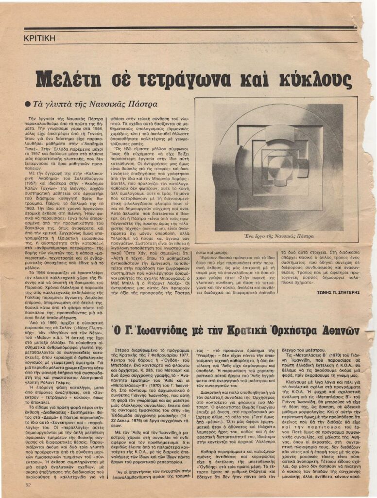 Απόκομμα, χαρτί, 30×23 εκ., στα ελληνικά, δημοσίευσης άρθρου του Τώνη Σπητέρη για την γλυπτική της Ναυσικάς Πάστρα. Στο ίδιο, άρθρο αναφερόμενο σε κονσέρτο του Γιάννη Ιωαννίδη με την Κρατική Ορχήστρα Αθηνών.