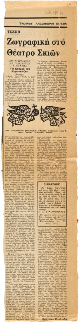 Απόκομμα εντύπου (05/05/1977), όπου δημοσιεύεται κριτική της έκδοσης των Απόστολου Γιαγιάννου, Αριστείδη Γιαγιάννου και Γιάννη Διγκλή με τίτλο “Ο Κόσμος του Καραγκιόζη”, που κυκλοφορεί από τις εκδόσεις “Ερμής”.